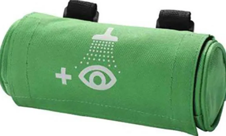 Siirrettävää silmäsuihkua varten tarkoitettu vyölaukku, jonka voi kiinnittää työvaatteisiin tai vastaaviin.
