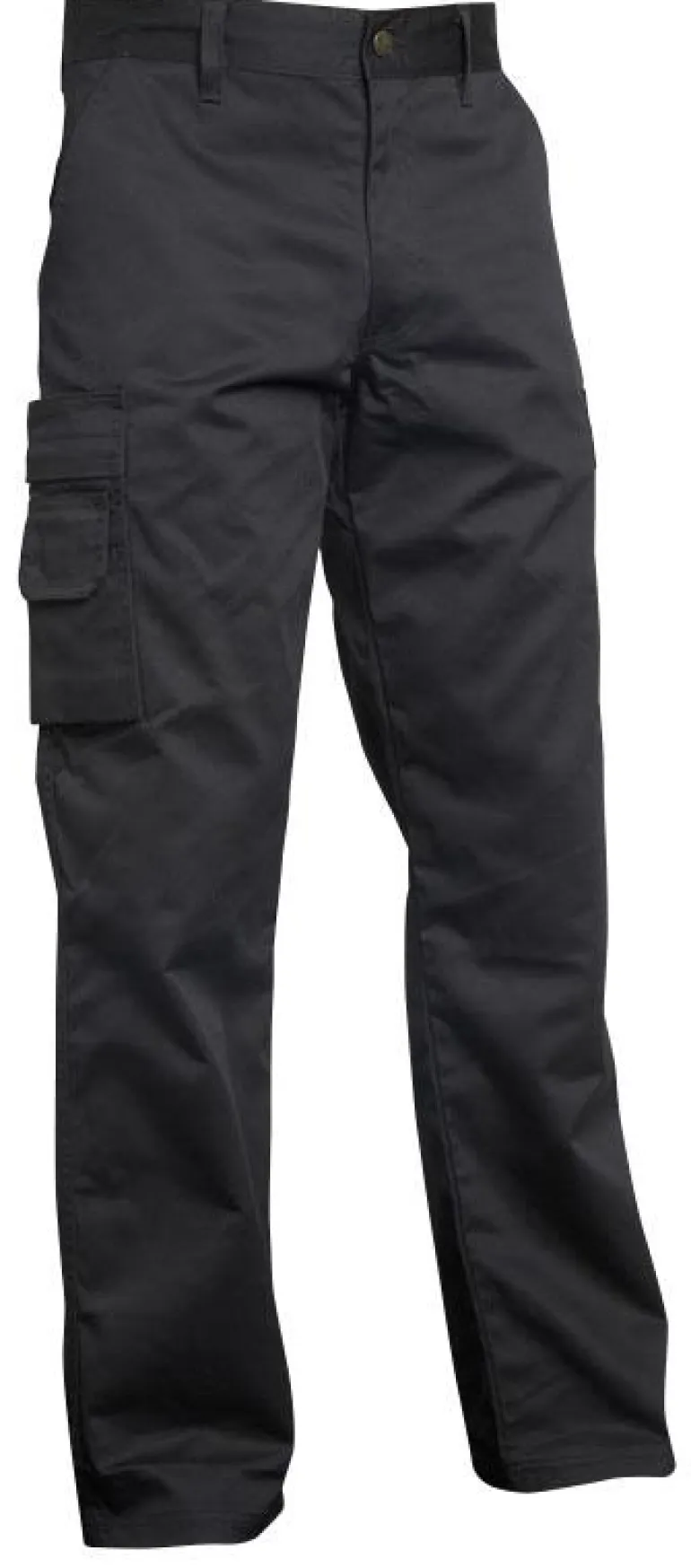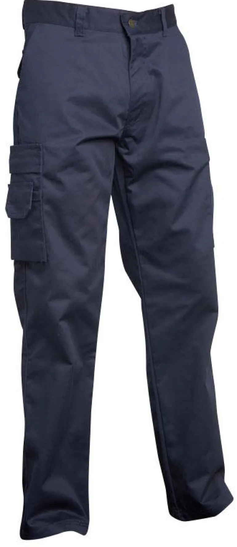 Laivastonsiniset housut, joissa on sisäetutaskut, vahvistetut takataskut ja kaksi kätketyllä vetoketjulla suljettavaa reisitaskua. Oikealla on suuri lisätasku, kännykkätasku ja kynälokero. 35 % puuvillaa/65 % polyesteriä.