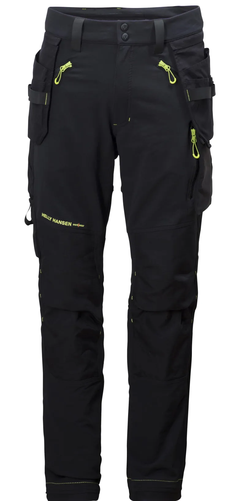 Mustat työhousut sopivat kovaan työhön. Housuissa on aktiiviseen työhön sopiva muotoilu, miellyttävä neljään suuntaan venyvä materiaali sekä Cordura-vahvikkeet polvitaskuissa, viivaintaskussa ja helmassa lisäävät kestävyyttä. Housuissa on pehmustettu vedenpitävä mobiilitasku ja irrotettava riipputasku.