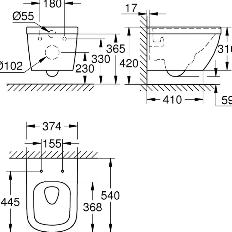 Kaulukseton, seinään kiinnitettävä WC-istuin piilotetulle vesisäiliölle. WC-istuimessa on vaakasuora viemäröinti, GROHE Triple Vortex -huuhteluteknologia ja puhdistushuuhtelu. Huuhtelumäärä 3/5 l.