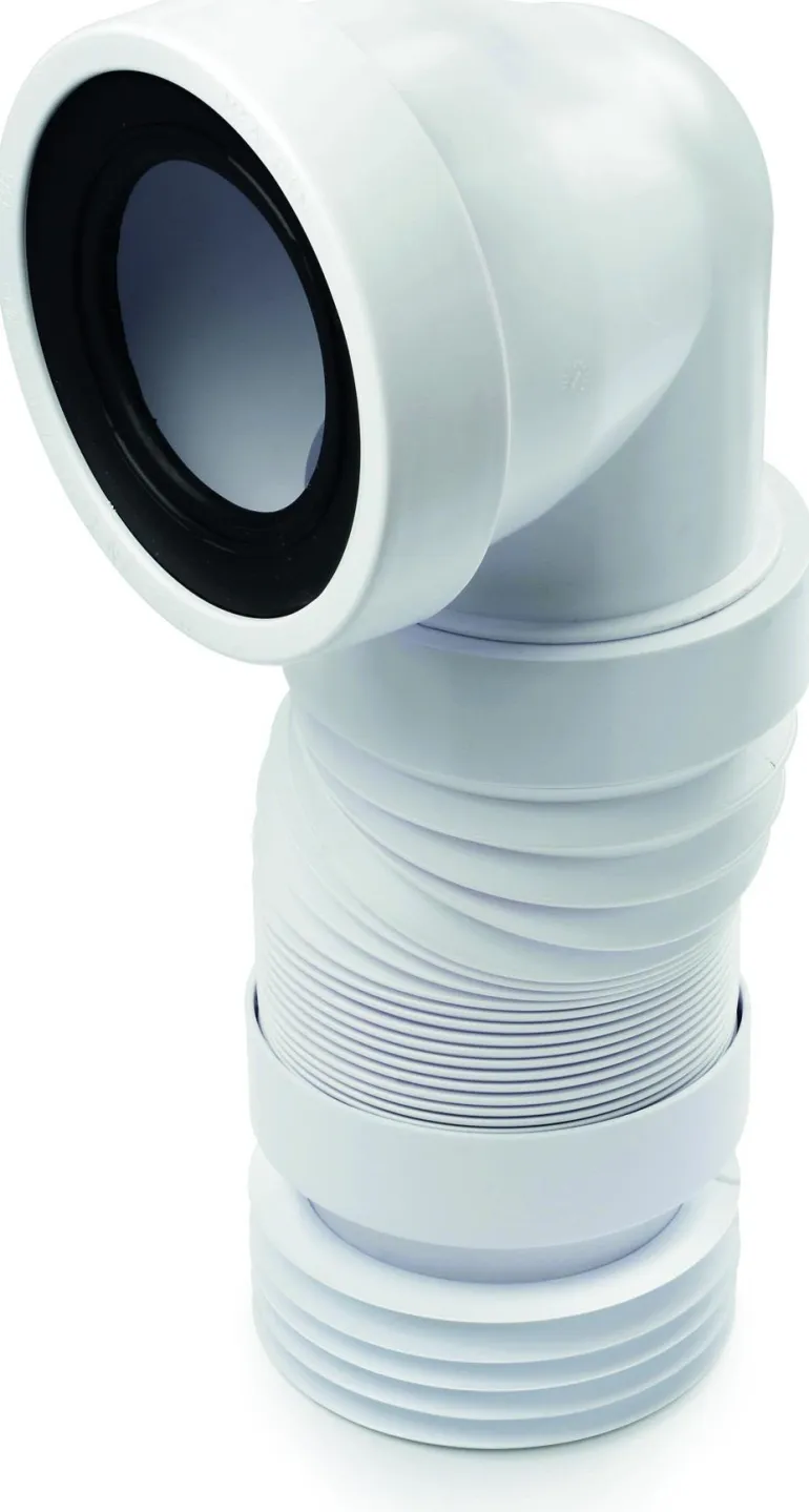 Joustava Wc-liitin WC-istuimeen liittämistä varten. Liittimessä on 90° kulma ja letku, jota voidaan pidentää 180-350 mm. Soveltuu käytettäväksi, kun WC-istuinta liikutetaan sivuttain. Kytkettäessä liittimen tiivisteet tulee voidella nestemäisellä saippualla tai vastaavalla