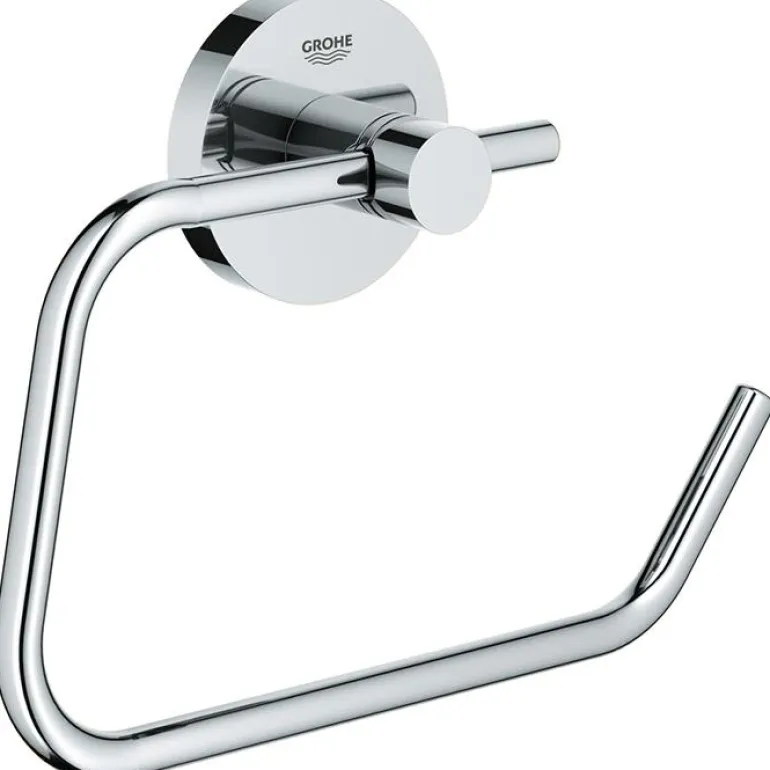 Grohe Essentials on WC-paperiteline ilman kantta. Tyylikäs ratkaisu moderniin kylpyhuoneeseen. Hohtava ja kestävä Grohe Starlight-kromipinnoite säilyttää virheettömän ulkonäkönsä vuosia.