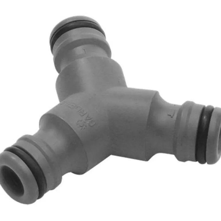 Y-haaroitin, joka jakaa vesilähteen kahteen osaan. Voit esimerkiksi sijoittaa sadettimen nurmikolle samalla kun kastelet kukkapenkkejä toisella letkulla. Haaroitinta voidaan käyttää 19 mm:n (3/4″) ja 13 mm:n (1/2″) letkujen liittämiseen.