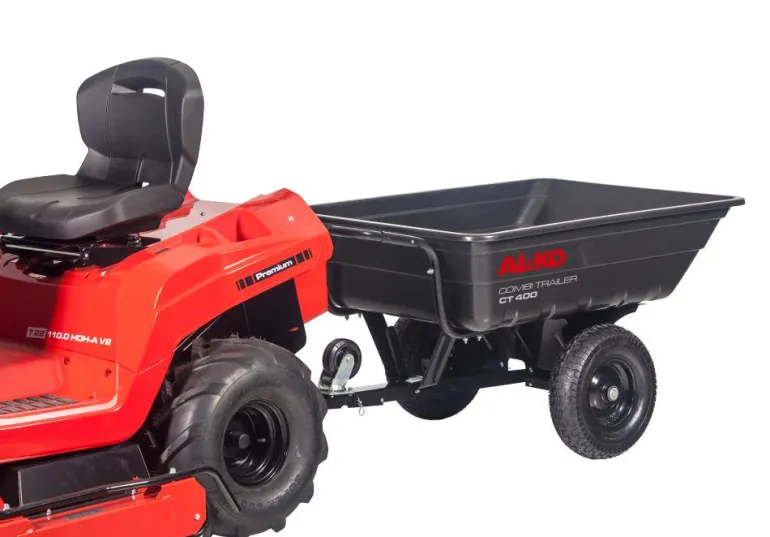 Käytännöllinen puutarhavaunu traktorilla vetoon. Vaunussa on suuret raskaat pyörät ja se kestää jopa 400 kg kuormitukset. Kippitoiminto ja kahva vetämiseen käsin kuin kottikärryissä.