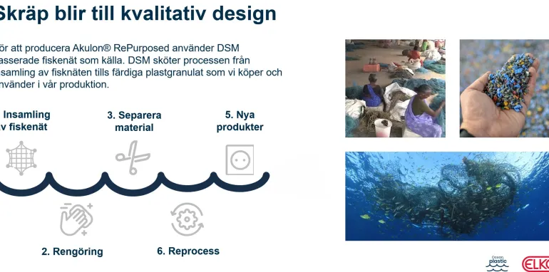 Osa Elko Plus Ocean Plastic -designsarjaa, joka sisältää sähkötuotteita, joissa pohjamateriaalina on hyödynnetty merimuovia kierrätettyjen kalaverkkojen muodossa.