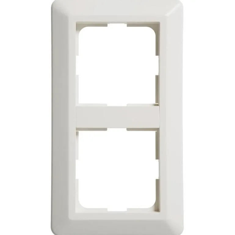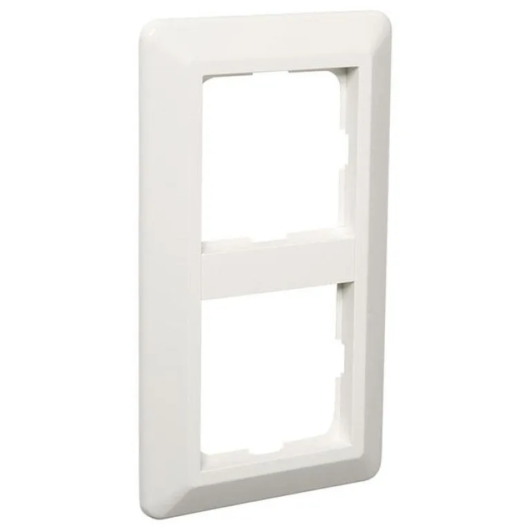 Yhdistelmäkehys, jossa on 2 lokeroa upotettaville kytkimille, pistorasioille jne. Malli voidaan asentaa sekä vaaka- että pystysuunnassa, sen mitat ovat 84 x 10,5 x 115 mm ja se on valmistettu valkoisesta kestomuovista.