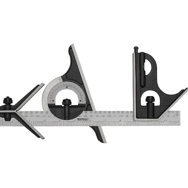 Teng Tools 270300106 on yhdistelmäkulmamitta astelevyllä, kulmavasteella ja keskipäällä. Kaikki osat ovat työnnettävissä asteikon viivoittimella ja mallissa on tasainen reuna astelevyssä ja kulmavasteessa.