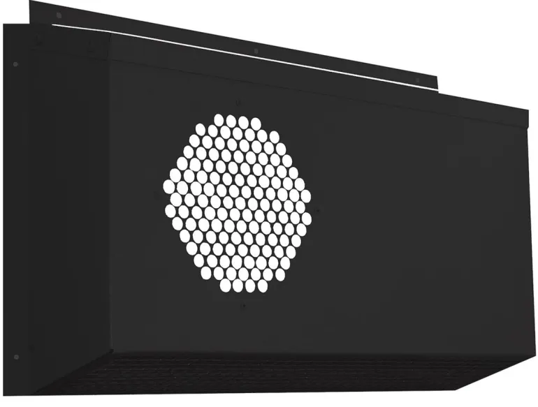 Yhdistetty ulko-/poistoilmaliitäntä seinäasennukseen. Poistoilma tyhjennetään vaakasuoraan laitteen etupuolella olevan pyöreän verkkosäleikön kautta.