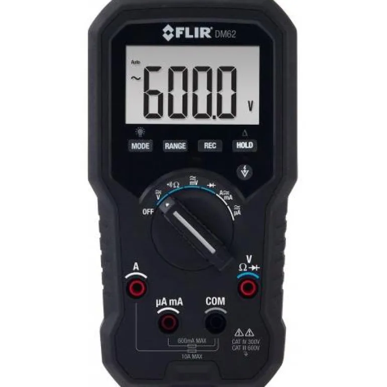 FLIR DM62 on kompakti digitaalinen yleismittari, True RMS AC/DC-jännite ja virta, jännitteen tunnistus ilman kontaktia, VFD ja jännitemittausalue 600 V:iin asti.