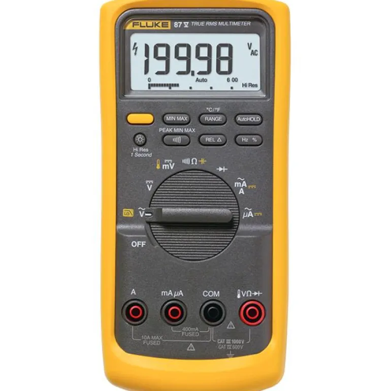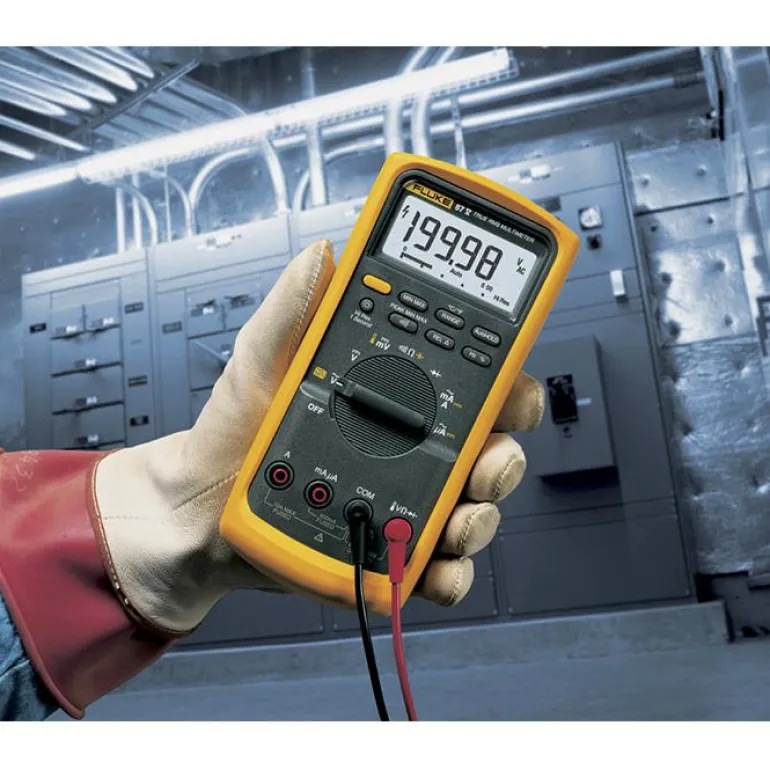 87 V:n yleismittari teollisuuskäyttöön, True-RMS. Yleismittarin enimmäisjännite on 1000 V AC/DC, ja se sopii säädettävien moottoriohjaimien ja muiden sähköisiä häiriöitä aiheuttavien laitteiden tarkkoihin jännitteen ja taajuuden mittaukseen. Sisäänrakennettu lämpömittari.