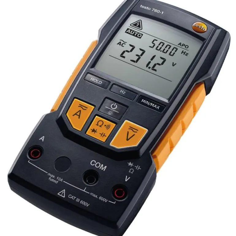 Testo 760-1 on digitaalinen yleismittari toimintopainikkeilla, jotka korvaavat perinteisen kiertokytkimen. Tämä helpottaa käyttöä ja parantaa luotettavuutta. Virheet ovat nyt mahdottomia, koska mittausparametrit havaitaan automaattisesti ja kytketään oikeaan mittausliitäntään. Lisäksi kyseiseen toimintopainikkeeseen syttyy valo. Testo 760-1 on varustettu suurella taustavalaistulla näytöllä, jonka jännitealue on 0,1 mV – 600 V ja virta-alue 1 mA – 10 A. Sopii käytettäväksi ympäristöissä, joissa lämpötila on -10 … +50 °C. Yleismittari 760-1:n koko on 167 x 84 x 45 mm (P x L x K).