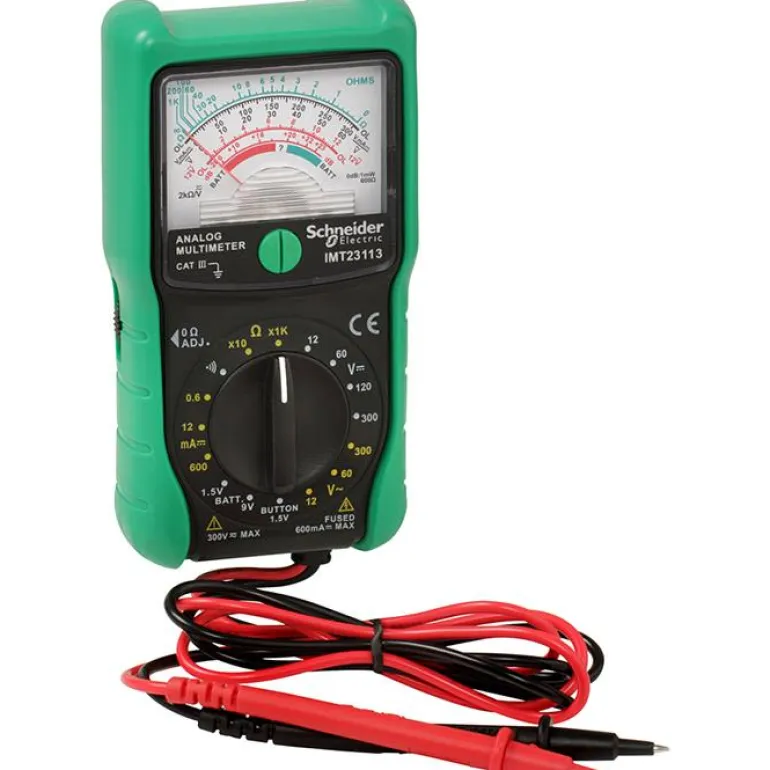 Schneider IMT23113 on analoginen yleismittari jännitteen, virran, resistanssin, kaapelitestin, akkuvirran ja desibelitason mittaamiseen. Mittari on tasasuuntaajatyyppinen ja mukana toimitetaan AA-paristo.