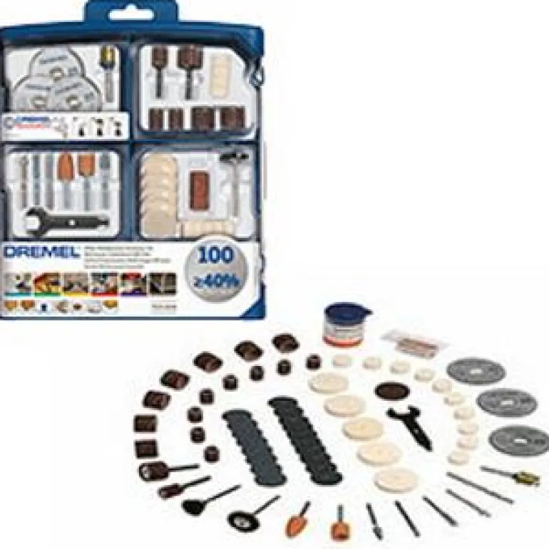 Yleistarvikesarja, 100 osaa. Mukana EZ SpeedClic -tarvikkeet, jotka mahdollistavat nopean ja vaivattoman tarvikkeiden vaihdon ilman avainta. Tätä tarvikesarjaa voi käyttää moniin eri materiaaleihin monissa eri projekteissa ja sovellusalueilla. Dremel-lisävarusteita on kätevä pitää varustelaukussa.