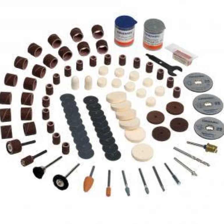 Yleistarvikesarja, 150 osaa. Mukana EZ SpeedClic -tarvikkeet, jotka mahdollistavat nopean ja vaivattoman tarvikkeiden vaihdon ilman avainta. Toimitetaan joustavassa säilytyslaukussa.