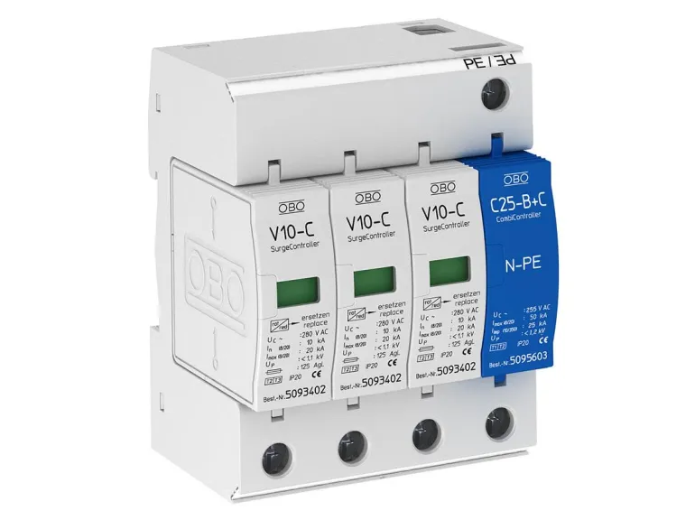 Ylijännitesuoja, tyyppi 2+3, 3-napainen + NPE, käytetään potentiaalin tasaamiseen ja yksikön suojaamiseen pää- ja ala-asemissa.